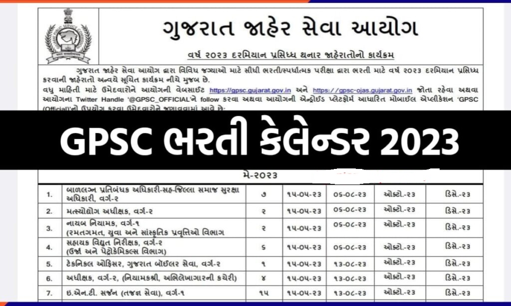 GPSC Calendar: GPSC Bharti: gpsc-ojas.gujarat.gov.in: ગુજરાત પબ્લીક સર્વીસ કમીશન એટલે કે GPSC મા અવાર નવાર મોટી ભરતીઓ આવતી રહે છે. GPSC મા આવનારી ભરતીઓ માટે મહિનાવાઇઝ ભરતી કેલેન્ડર અગાઉથી જાહેર કરવામા આવે છે. વર્ષ 2023 માટે GPSC દ્વારા ભરતી કેલેન્ડર જાહેર કરવામા આવ્યુ છે. જેમા આવનારા મહિનાઓમા કઇ કઇ ભરતીઓ આવવાની છે તે જોઇએ.