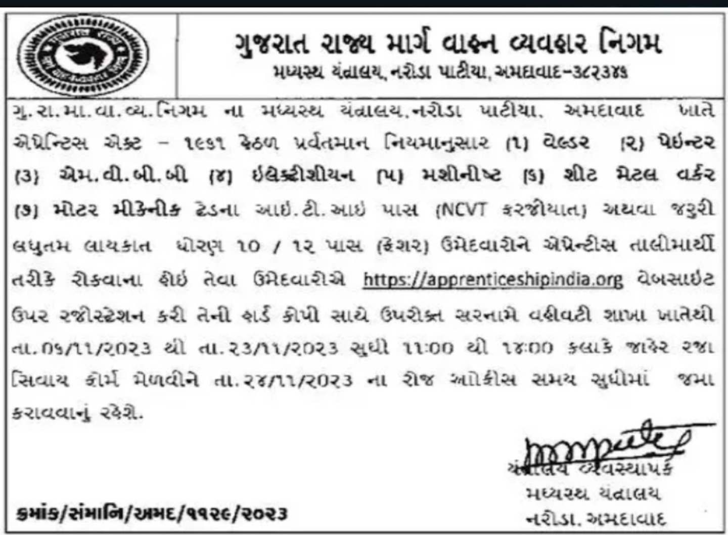 Candidates first Registration On Apprenticeindia.org than Receive Application Form from GSRTC Naroda Patiya, Ahmedabad.