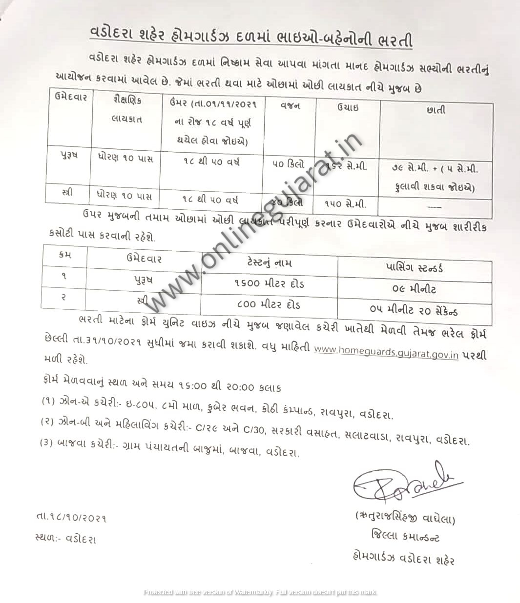 - In the state of Gujarat, 4, 6 Commissionerate areas and 22 (2) district units / zones / divisions will be recruited 2,8 honorary home guards members. The recruitment process for the recruitment of these honorary home guards members will be conducted from the office of the concerned District Commandants. Interested candidates should contact the unit office or district office of your area for recruitment. These Home guards members are to be recruited as honorary members. In which the Government will be called on important duty if required. When called on duty, as per the prevailing rules of the Government, they will be entitled to Rs.300/- duty allowance and Rs.5/- laundry allowance per day as honorary salary. This recruitment does not have to be done as a permanent employee. But honorary home guards members are to be recruited in the honorary organization. So that no rights as a permanent employee will be eligible.
