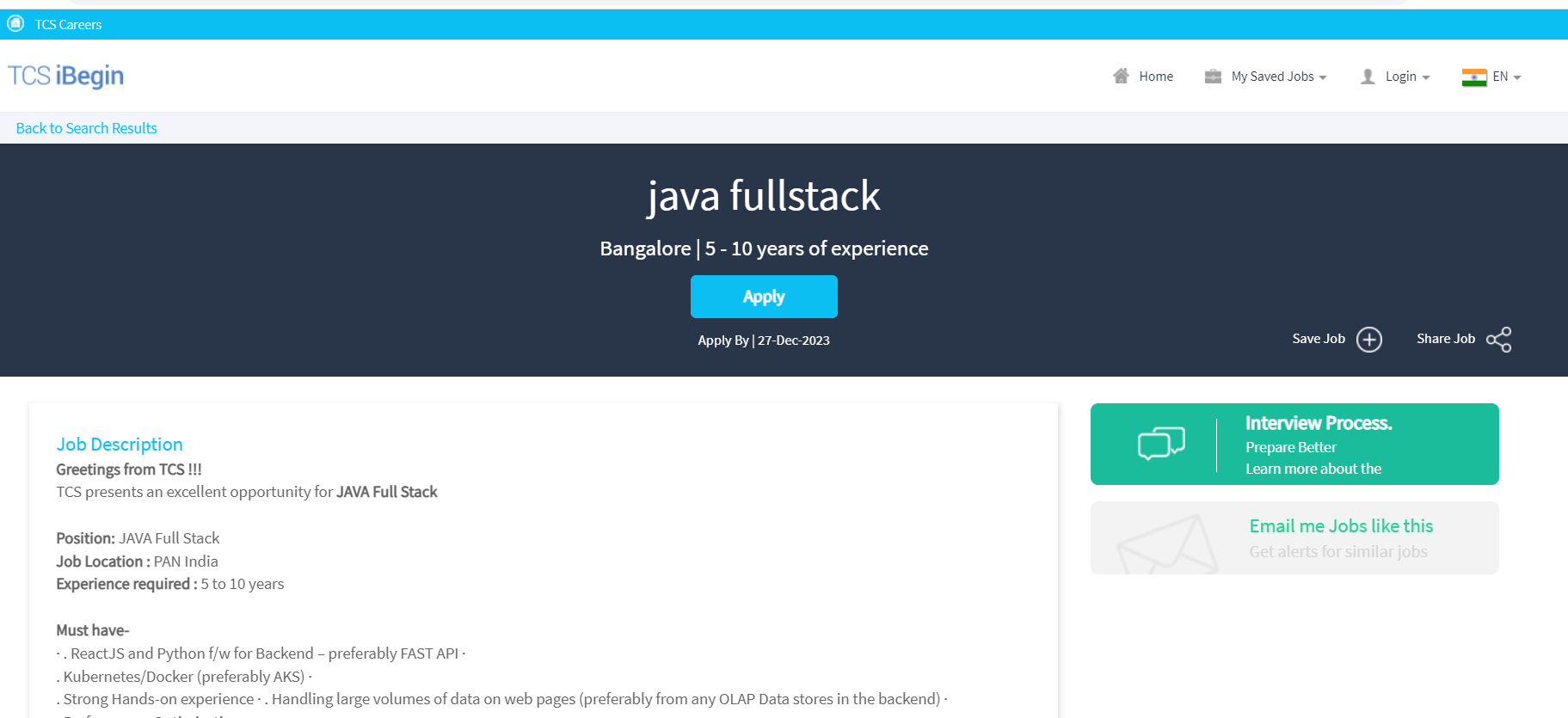 टीसीएस जावा फुल स्टैक: टाटा कंसल्टेंसी सर्विसेज (टीसीएस), एक अग्रणी सूचना प्रौद्योगिकी परामर्श कंपनी। नवीनतम नौकरी घोषणा में, टीसीएस ने बैंगलोर में कार्य स्थान के साथ जावा फुल स्टैक पदों के लिए नौकरी रिक्तियों की घोषणा की है। TCS Java