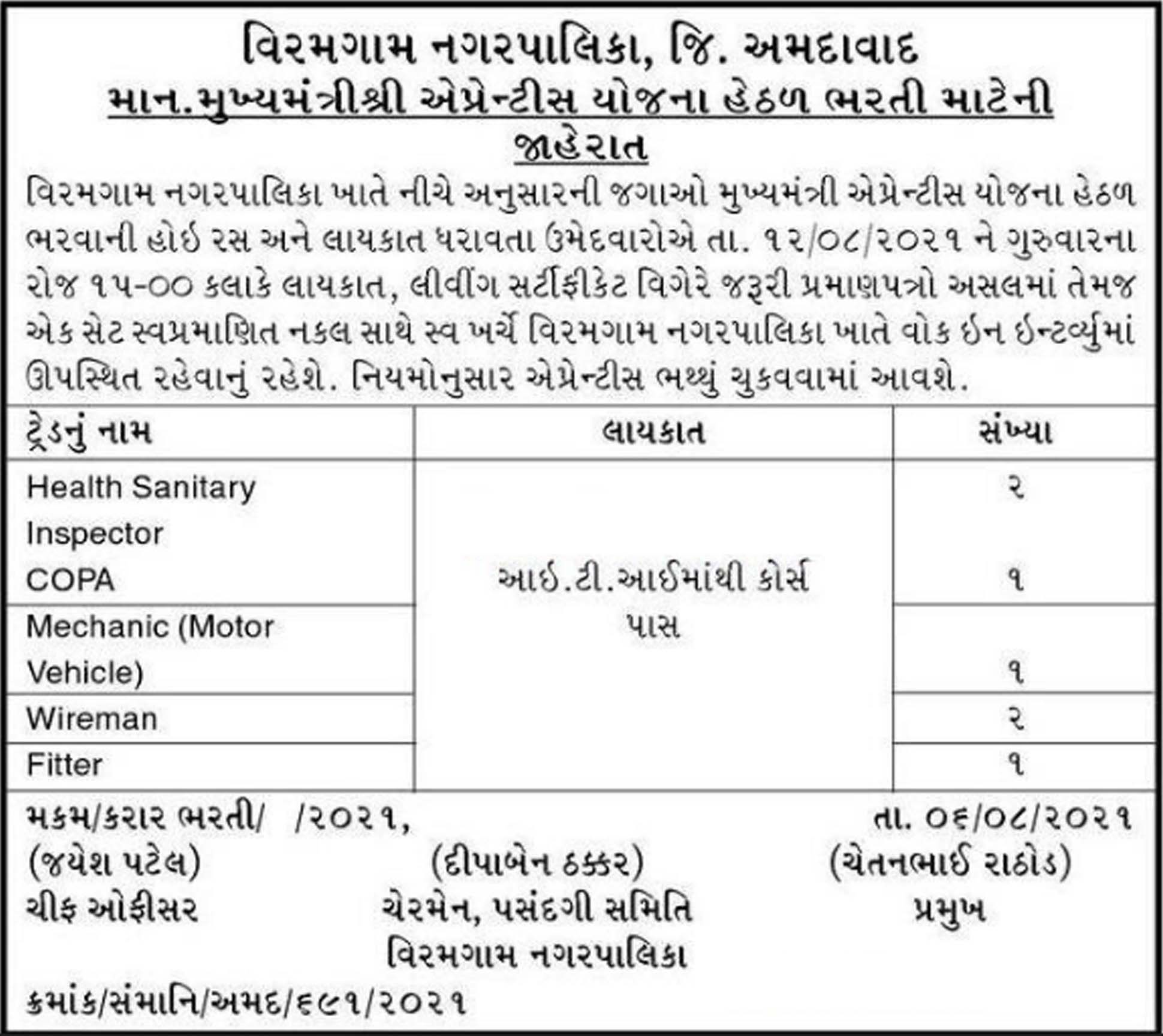 Viramgam Nagarpalika Ahmedabad Recruitment for Apprentice Posts 2021